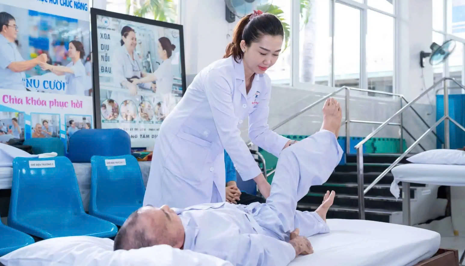 Bác sĩ Khoa Phục hồi chức năng, Bệnh viện Thống Nhất (TP HCM) hướng dẫn người bệnh cao tuổi tập luyện phục hồi chức năng nhằm cải thiện khả năng vận động phòng ngừa té ngã.