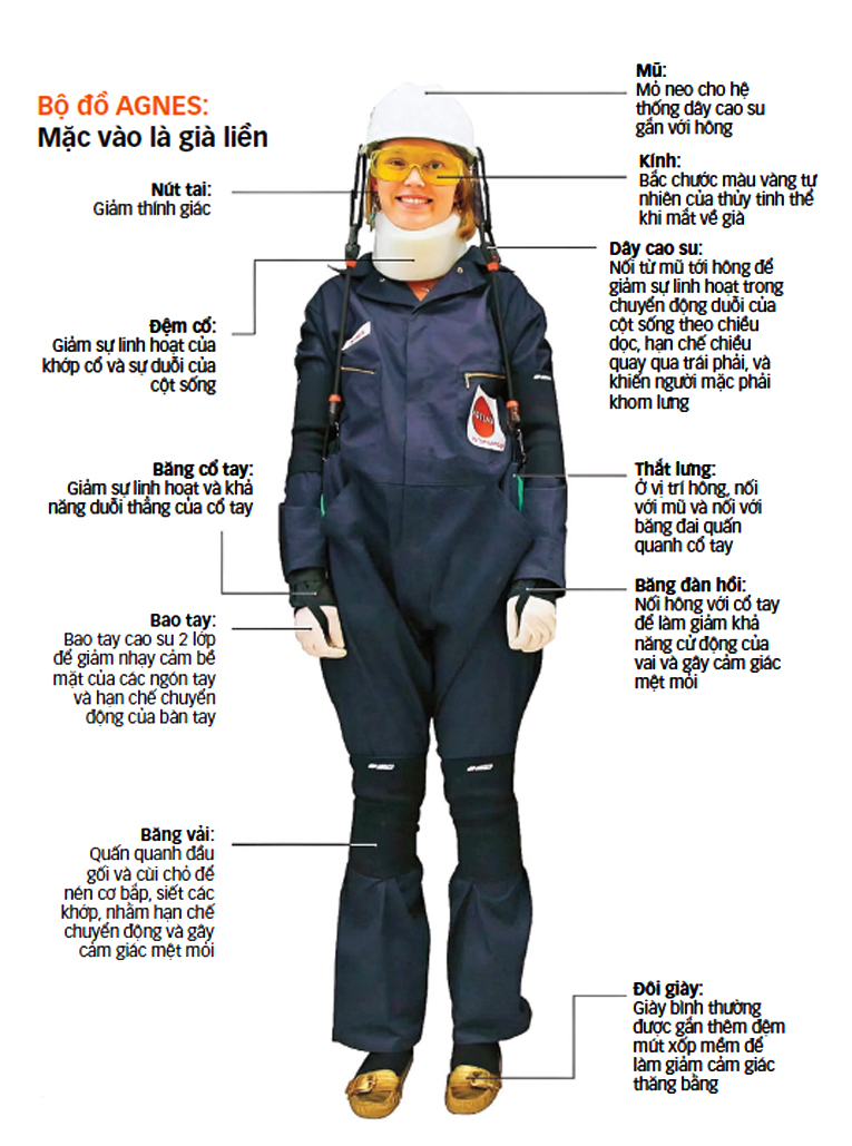 Chính nhờ đó, những bộ đồ mô phỏng tuổi già như AGNES mang lại cho các nhà nghiên cứu, kỹ sư, nhà thiết kế, sinh viên… cơ hội thấu hiểu giới hạn của người cao tuổi, từ đó tìm cách thiết kế phương tiện công cộng, nhà cửa, đồ gia dụng, bài tập thể dục hay cửa hàng mua sắm thân thiện hơn.